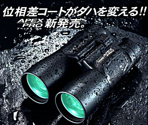 ◎フルマルチコーティングに更にフェーズコート(位相差コーティング)をダハ面にプラス、反射面には増反射コートを施すことにより、ダハ式双眼鏡の常識を破る、明るさ、ハイコントラスト、高解像力を実現。 ◎窒素ガス封入のコンパクトで操作性に優れたセンターフォーカス式。完全防水設計。 APEX-PRO HR 8×42 \60,000(ケース付) ・倍率:8倍/対物レンズ:42mm ・サイズ:H14.6×W12.4cm/重さ:705g APEX-PRO HR 10×50 \68,000(ケース付) ・倍率:10倍/対物レンズ:50mm ・サイズ:H17.2×W13.1(cm)/重さ:815g |